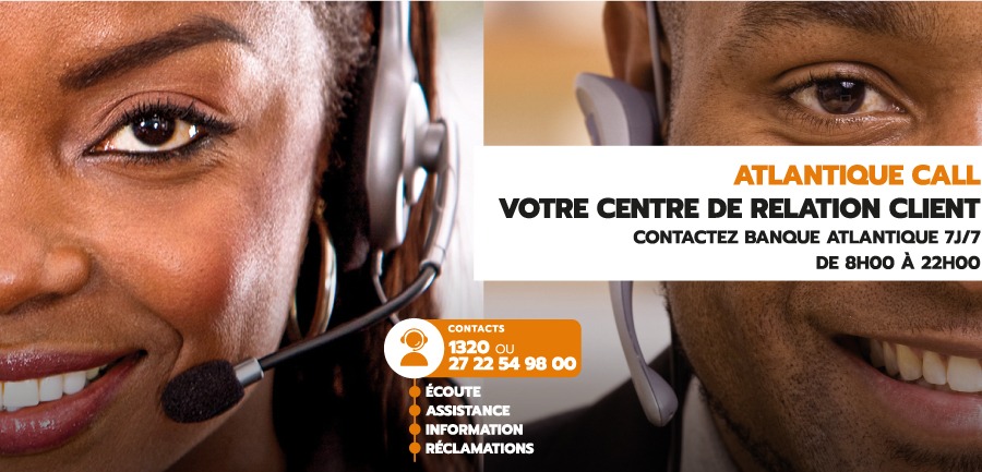 ATLANTIQUE CALL, votre Centre de Relation Client accessible 7J/7, de 8H00 à 22H00 au 1320 ou 27 22 54 98 00