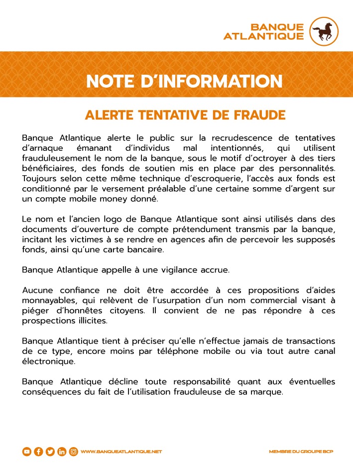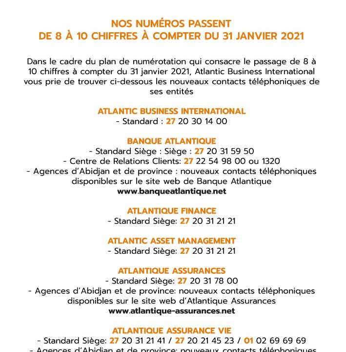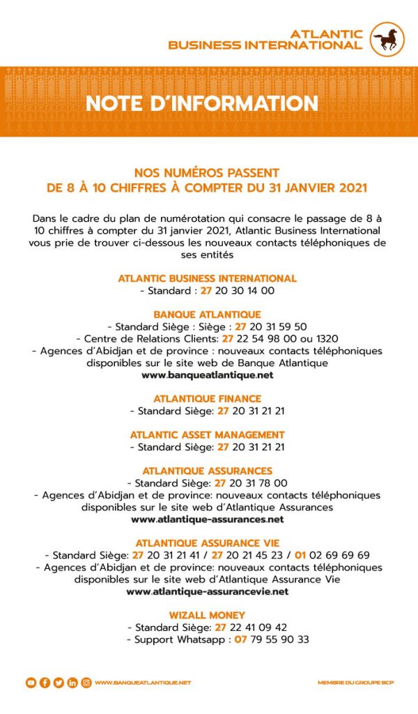 Banque Atlantique a le plaisir de vous informer de l’ouverture d’une nouvelle agence à QUINZAMBOUGOU, sise face au restaurant « le Loft ». A travers l’ouverture de cette 24ème agence, Banque Atlantique poursuit le maillage ciblé du territoire national, conformément à sa stratégie d’expansion du réseau visant à offrir à […]