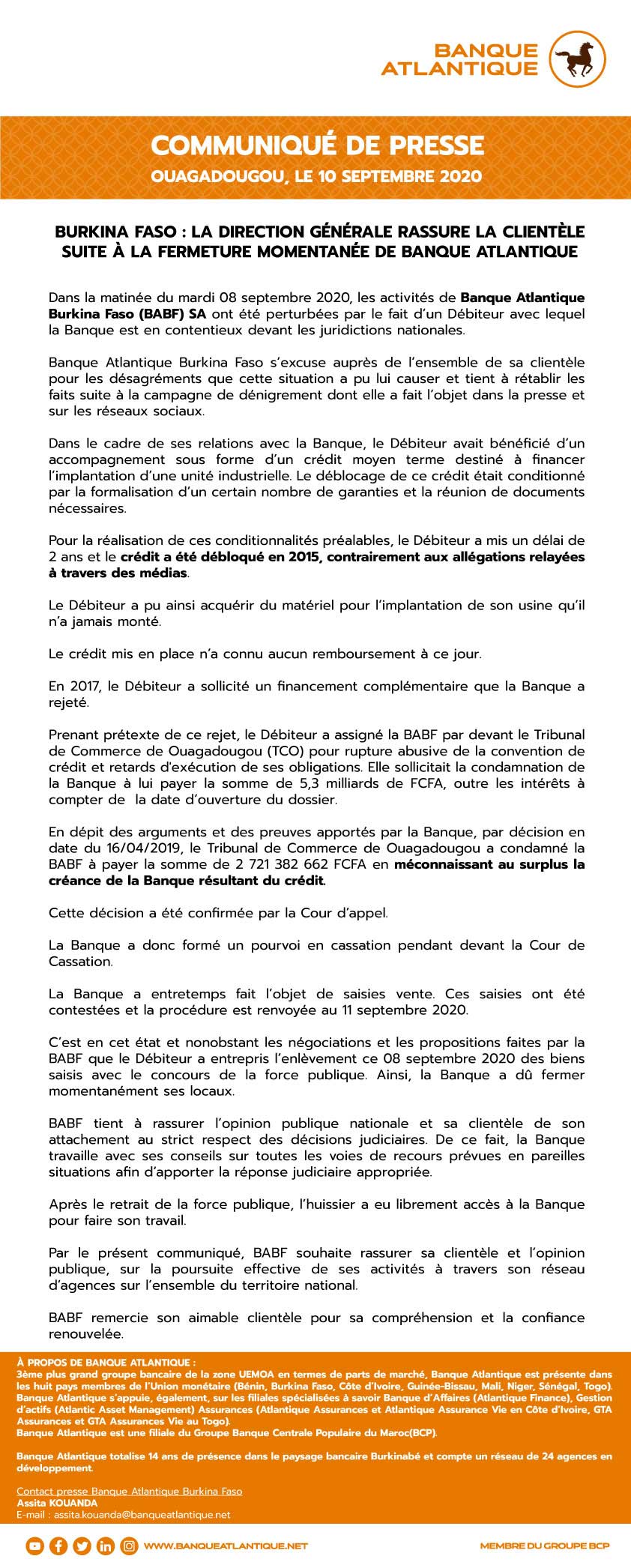 BURKINA FASO : LA DIRECTION GENERALE RASSURE LA CLIENTELE SUITE A LA FERMETURE MOMENTANEE DE BANQUE ATLANTIQUE