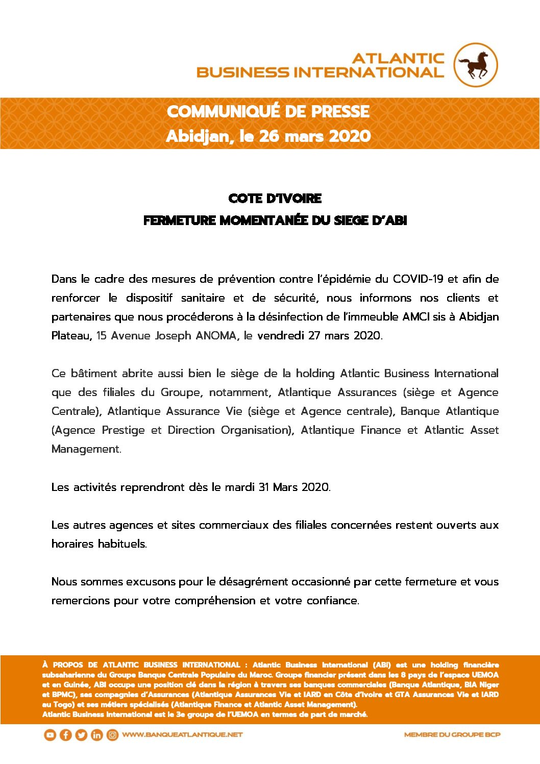 COTE D’IVOIRE : FERMETURE MOMENTANÉE DU SIÈGE D’ABI