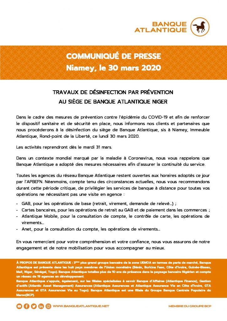 TRAVAUX DE DÉSINFECTION PAR PRÉVENTION AU SIÈGE DE BANQUE ATLANTIQUE NIGER